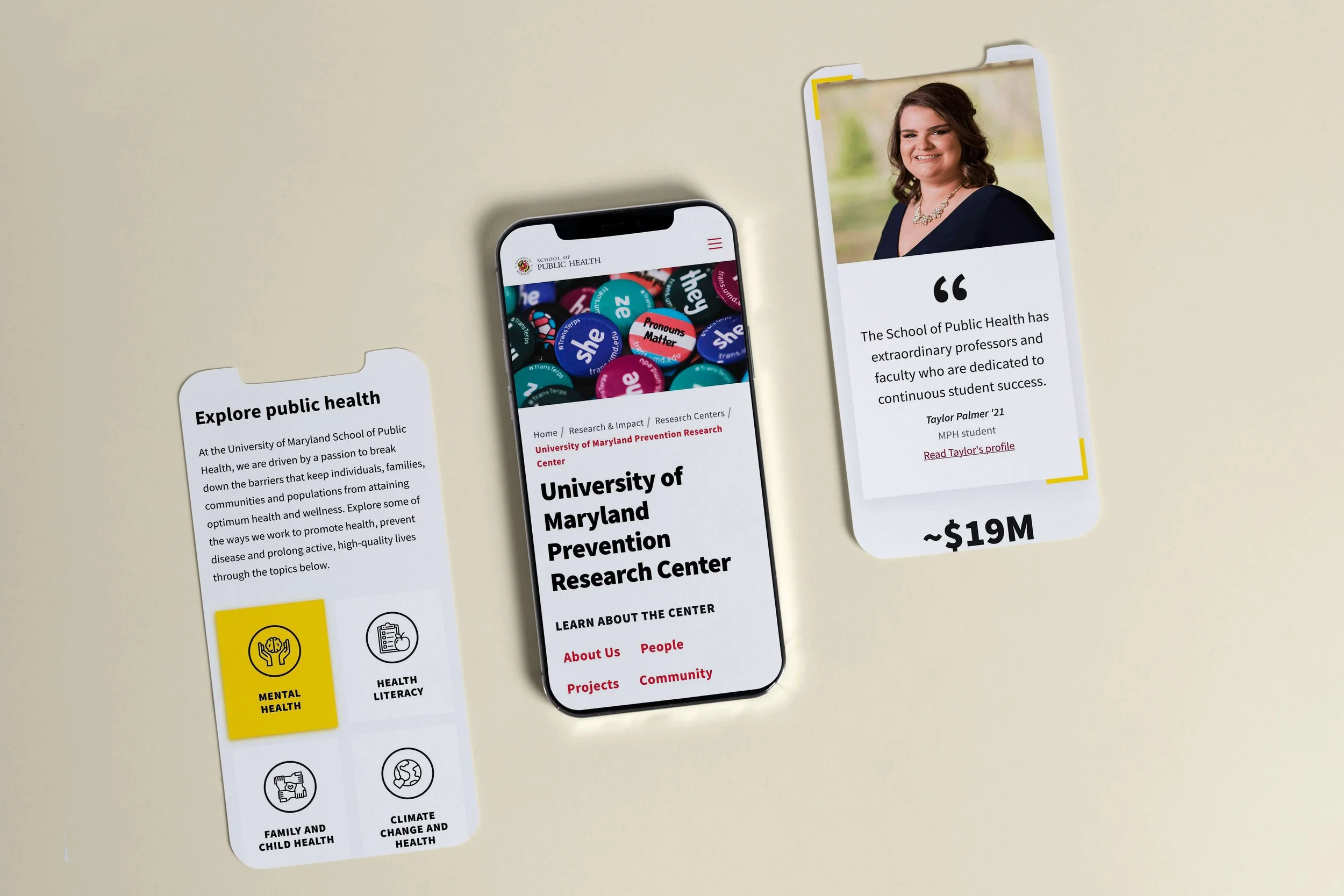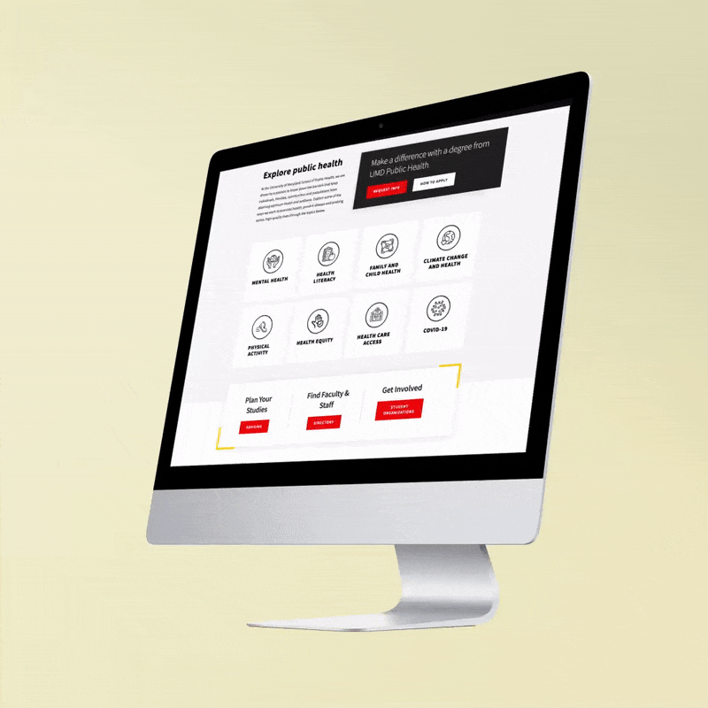 Through research, community engagement, and mentorship from faculty who are leaders in their field, the University of Maryland School of Public Health (UMD SPH) provides their students with the support they need to build a career in public health and make a difference in the world. Our goal was to position UMD SPH as the standard for 21st century Public Health schools and initiatives by building them a more robust, organized and modernized website that demonstrated their impact at the local, state, regional and national levels. We worked to develop an online experience that would attract prospective students through emphasizing the unique undergraduate opportunities UMD SPH offers, and place its programs and research center more central in the website's architecture.